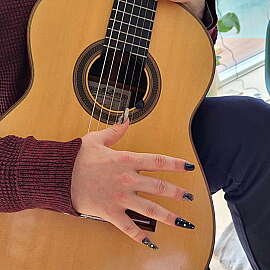 It explores the essential role that the nails play for any guitarist. As a classical guitarist, your nails form an extended part of your instrument. Regardless of gender, well-kept nails are a prerequisite for being able to play accurately, form timbre and dynamics and add personality. In Sorte Negle, the role of the nails is magnified applying exaggeratedly long artificial and painted nails to the instrumentalist.